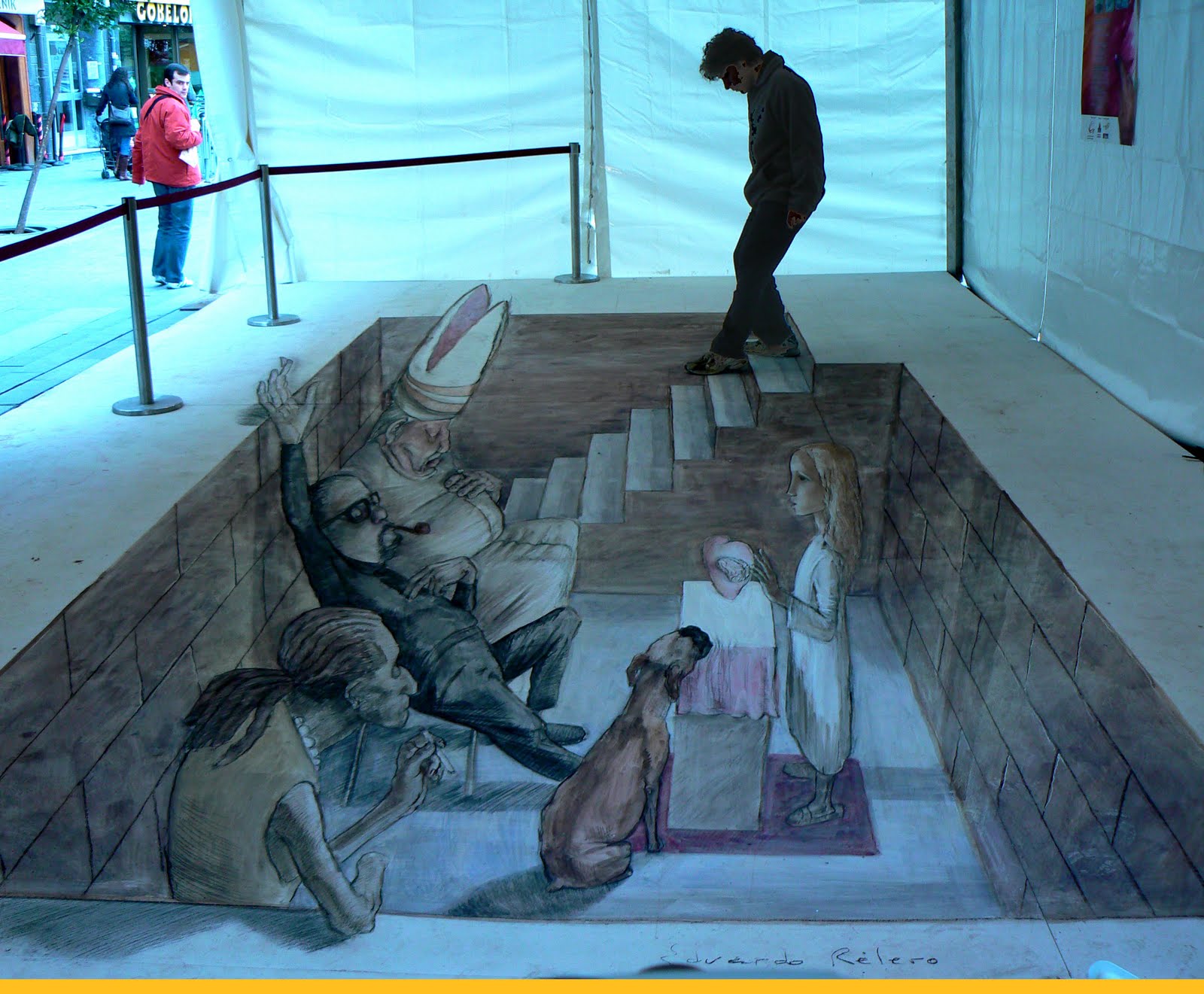 Eduardo Relero es un pintor argentino afincado en Sevilla La Nueva, en la Comunidad de Madrid, y es uno de los principales estandartes del anamorfismo, una técnica usada en la pintura y en el cine que consiste a grandes rasgos en crear ilusiones ópticas.